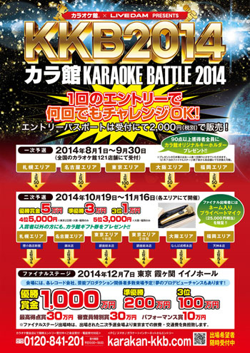 「KKB2014カラ館KARAOKE BATTLE 2014」では、“誰もが認める歌唱力を持った、最強の歌い手”を大募集。一次予選は全国のカラオケ館にてエントリーを受け付け。受付期間は8月1日(金)より9月30日(火)各店営業終了時間までとなっている。
