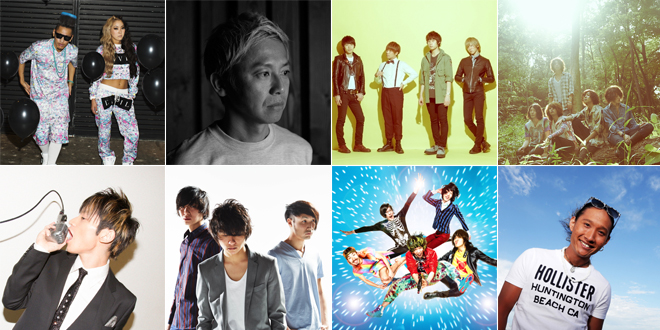 ▲写真左上より:CREAM、GAKU-MC、go!go!vanillas、HAPPY、SKY-HI、The Flickers 、爆弾ジョニー、平井 大。