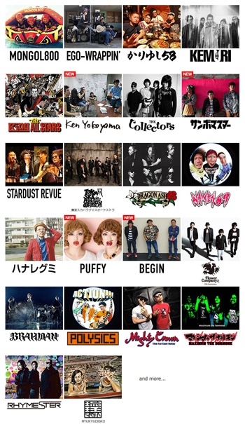 MONGOL800 / EGO-WRAPPIN’ / かりゆし58 / KEMURI / THE King ALL STARS / THE COLLECTORS/ STARDUST REVUE/ 東京スカパラダイスオーケストラ/ Dragon Ash / NAMBA69 / ハナレグミ / PUFFY / フラワーカンパニーズ / BRAHMAN / POLYSICS / MIGHTY CROWN / マキシマム ザ ホルモン/ RHYMESTER / RYUKYUDISKO / and more….