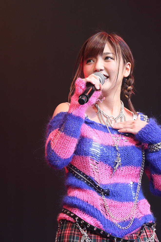 「暑いですね。すごい。やー、でもやっぱ楽しいです。あの、フェス形式の、いろんなアイドルさんたちが出演するアイドルイベントは、1年前の<アイドル甲子園>以来で。いや、ドキドキしたんです。けど、何人かマノフレのみんなも来てくれていて。ありがとうございます。初めましての方も、よろしくお願いします。真野恵里菜です。」