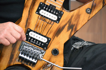 高崎:そう。それに、ブリッジの高さをストラトのオールドとかと同じくらいにしたくて、フロイドローズを落とし込んでセットしてる。ランダムスターは普通のセットアップでブリッジが結構高いから、最初にプライムを作ったときに、こういう仕様にしてもらったんだ。俺の場合はブリッジが低いほうが、より柔軟に右手を使えるから。フレーズによって右手のフォームを微妙に変えたり、自然と変わったりするんだけど、そういうときに違和感がないんだよね。