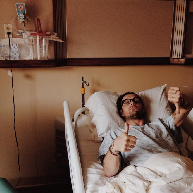 ツアー・バスが急停止した際、肋骨を痛めたキングス・オブ・レオンのネイサン・フォロウィル(Dr)が、Twitterに病床での写真をアップし近況を報告した。