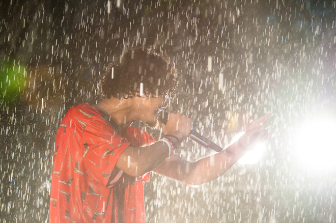 しかしこの日の天気はやはり不安定で、さあ開演、というタイミングで雨がまた降り出してしまった。それでもライヴは定刻どおりにスタートする。1曲目は、このツアーのテーマにもなっているナンバー「共に歩む道」だ。ステージには4人のメンバーが上がり、ヴォーカルのSHUNKUNは客席中央に現れた。実はSHUNKUNの立っている位置から後方の客席は、中止となった2月の公演のチケットで入場したリフレンジャーが陣取る席なのだ。まずは、半年前に見ることができなかったファンに向けて、もっとも近い位置で歌おうということなのだろう。降り出した雨はすぐに豪雨になり、SHUNKUNはずぶ濡れ。しかしそんなことは気にする様子もなく、ステージ上の4人はパワフルにプレイし、SHUNKUNは飛び跳ねながらトレードマークの“メロディラップ”をシャウトしまくった。