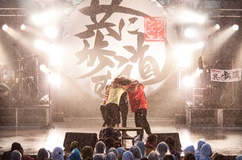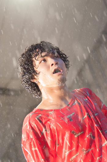 熱いパフォーマンスで1曲を終えると、“今日の台風で、ここに来られなかった仲間がたくさんいます。だから今日は、来られなかった仲間たちに届くように、全力で楽しむことを約束してください。今日は全員の気持ちを背負ってライヴやります!”とSHUNKUN。そしていっこうにやまない雨の中、「笑顔の作り方」、「アゲアゲええじゃないか!!!」と、彼ららしい、明るく元気のよいナンバーを力強くプレイする。