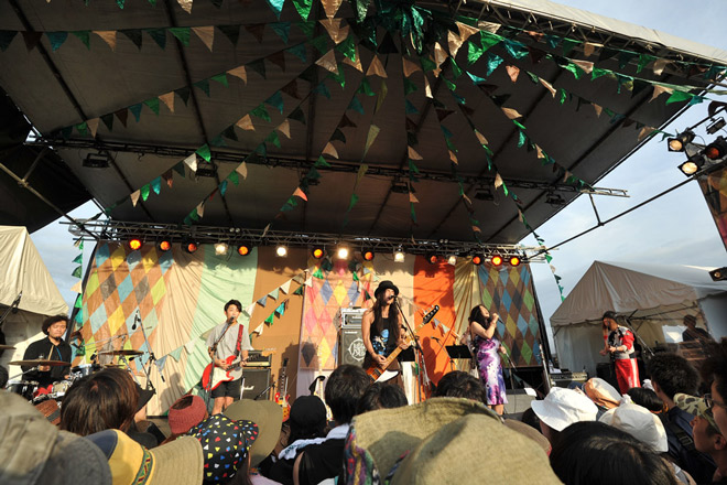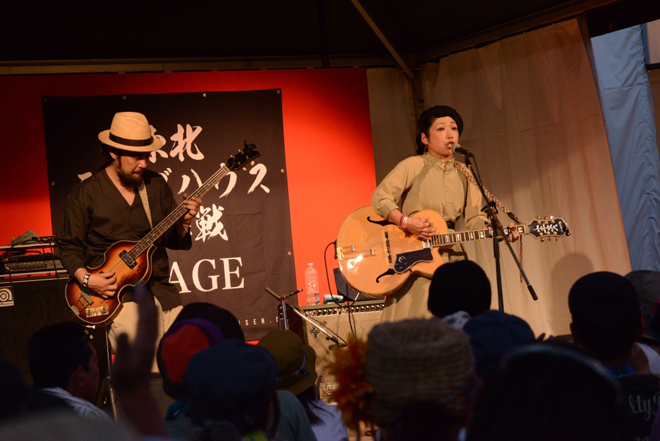 隣りのRED STAR FIELDでBEGINのステージが終わるのと同時に始まったT字路s。女性ギターヴォーカルと男性ベースのユニットで、「日本中旅しててようやくライジングにたどり着くことが出来た」という。ハスキーでブルージーなイトウタエコの歌声は赤く染まり始めた会場の上空によく似合っている。オンナのドロっとした情念をカラッと揚げてさらりと歌にしてしまったような、でも切なさとやりきれなさをジメジメしたまま抱えているような、そんなブルースだったりフォルクローレだったり。曲によってその表情は変幻自在だ。そしてわずか30分のステージが終わると、太陽が壮絶なオレンジ色を残したまま沈んでいくところだった。