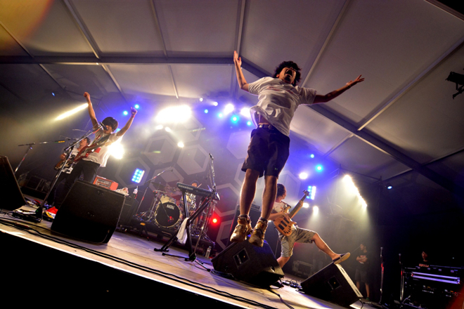 2013年、一般公募枠で応募総数553組の中から選ばれRINSING★STARに出演したFOLKSが今年もdef garageでパフォーマンス。北海道恵庭市出身の5人組バンドだ。しかも今日は、SUMMER SONICでオープニングを務めてきてからのライジング出演という強行スケジュール。バンドサウンドにシンセサイザーやプログラミングを導入し、太鼓や電子パッドなどさまざまな音が加わり壮大なサウンドが展開されていく。北海道という大きな土地で育ってきた彼らのルーツを感じさせる。電子音を使用した近代的なサウンドワークなのにどこか懐かしさがあり、心地よい。MCなしの30分に込められた音楽を愛する気持ちが真摯に伝わってくるライヴだった。