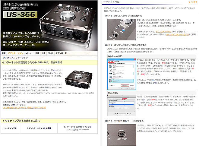 TASCAM US-366の製品ページに新たに公開されたのは、「インターネット放送を行うための『US-366』徹底活用術」と題したアプリケーションガイド。ニコニコ生放送や、USTREAMによるインターネットを使った生放送を行うためのセッティングを掲載している。