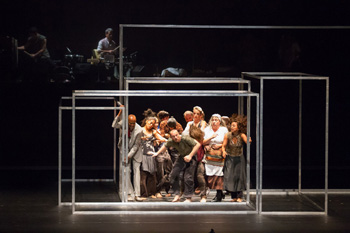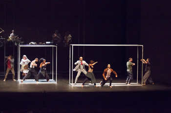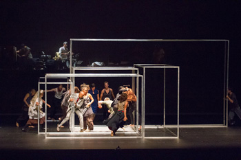 この舞台、もうひとつ注目すべきは現代イギリスを代表する彫刻家アントニー・ゴームリーが手掛けた巨大なフレームの舞台装置にある。舞台上で進行する現代アートのインスタレーションは息をのむ美しさだ。