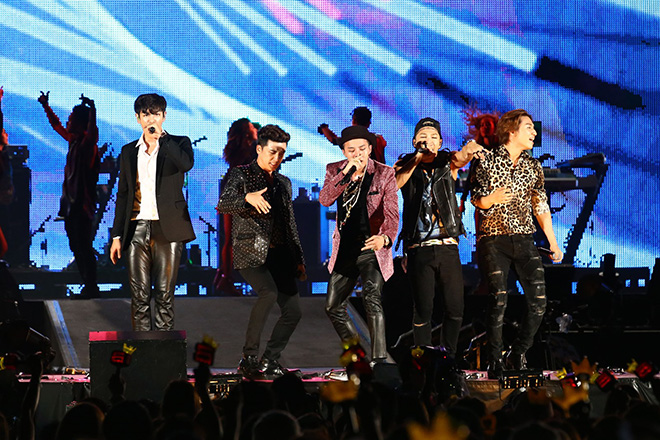 黄色い王冠ペンライトが会場中で揺れる中、初のヘッドライナーを務めたのはBIGBANG。メンバー5人揃ってのパフォーマンスは久々ということもあり、「TONIGHT」が始まった瞬間に客席からは“BIGBANG、BIGBANG”とノリのいい大合唱が沸き起こる。MCではメンバー全員の声も聞けた。「2年前もa-nationに出ましたが、今回はトリとしてステージに帰ってきました!」とV.Iに続き、D-LITEも「ホントに嬉しいです、夢みたい。」と笑顔。「皆さんお久しぶりです。」とT.O.Pが話しかけると、G-DRAGONが「お久しぶりです。皆さんと会えて嬉しいです。最後まで遊びましょう!」と続け、SOLが「最後まで楽しんでいって下さい。」と締めくくる。そのあとはキラーチューン「FANTASTIC BABY」で歌って踊っての大盛り上がり。「HOW GEE」ではG-DRAGONがT.O.Pに顔を近づけてラップバトルを仕掛け、観客たちを沸かせるシーンも。ピアノの旋律が心を揺さぶる「Haru Haru」や「BAD BOY」などせつなさをたっぷり含んだメロディアスなナンバーをしっとり歌った後は、BIGBANGのロゴマークが入ったトロッコに乗り込んで場内を1周。最後に打ち上げ花火とともに聴こえてきた「MY HEAVEN」で盛り上がりは最高潮。みんなで天国まで高まったあと「a-nation、まだいけるの?」とV.Iが叫び、いきなり「FANTASTIC BABY」を再演。予定外のアンコールのプレゼントに、観客たちはこの日最高の盛り上がりを見せ、熱狂と感動に包まれた中、a-nation「stadium fes.」初日の幕を閉じた。