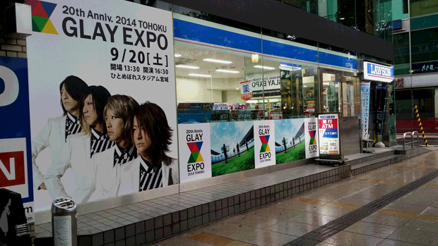 2013年にも函館に登場した「GLAY LAWSON」。店内・店外ともにGLAYの写真とGLAY EXPOロゴでラッピングされるのは仙台柳町通店、仙台定禅寺通店、仙台あすと長町店、仙台小田原一丁目店の4店舗となる。