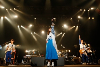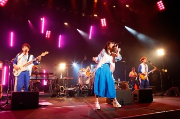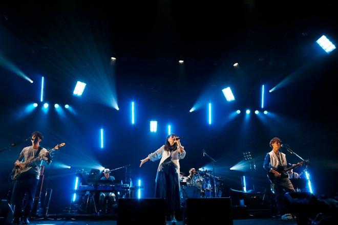 幻想的なブルーのライトの中、メンバーがステージに姿を現すと温かな拍手と大歓声が沸き起こった。ひと呼吸ついたあと、NANAEの伸びやかな歌声がホール内に響き渡り、「フォーリン・ラブ」で記念すべきライブの幕が上がった。いつもよりきっと大きなステージに合わせるかのように、大きく手を振り、腕を伸ばしながら、楽曲の世界観を歌声だけでなく、体全体で伝えようとするNANAE。その愛らしくも頼もしい背中を、MICHIRUの力強いギターの音が押していく。4人の緊張感は痛いほどに伝わってくるが、それがプレイには慎重さと丁寧さになって現れていて、いい効果をもたらしているようだ。