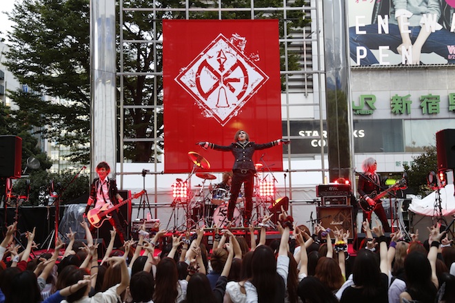 17時40分、DIAURAが新宿東口アルタ前公園広場特設ステージ上に姿を現した。メンバーの登場と同時にこだました数多くの叫び声。フラッグを振り翳しボーカルのyo-kaが姿を現すと同時に、ゲリラ・ライブが幕を開けた。