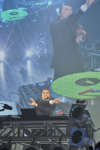開演時間になると場内が暗転。KREVAの10年の歩みを綴ったオープニングの映像が流れたあと、スモークに包まれたステージにKREVAが登場。舞台中央には2台のターンテーブル、コントローラー、DJミキサー、パットなどを並べた機材ブース。レーザーが飛び交う中、ブースで機材を操りながらヘッドセットで1曲目の「基準」で、いきなりマシンガンラップを披露。“俺のSWAGは神懸かり的”と言い放ったあとは、そこから「ストロングスタイル」へと、冒頭からいきなり強烈なラップチューンを連打。目をぎらつかせ、さっきまでノリノリでDJやってた人とは思えない変わりよう。