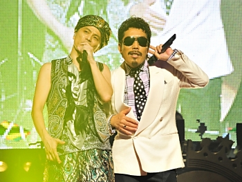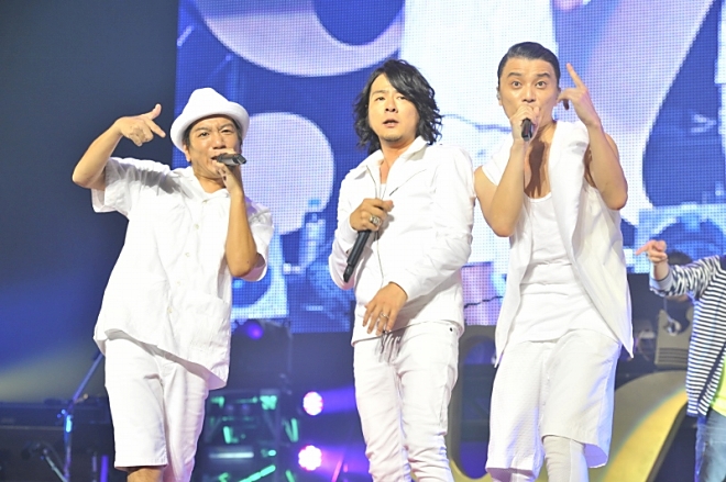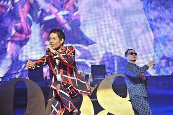 ULが「La La Like a Love Song」で登場した後は白い衣装を着た3人が揃って観客の大声援&大合唱を受けながら「イツナロウバ」でKICK THE CAN CREWに。RHMESTERを迎え、火柱がド派手に打ち上がった「神輿ロッカーズ」ではステージの6MC+お客さんで祭りは絶頂に! そこからのRHYMSTER、KICKへとマイクバトンをしていった「マルシェ」。豪華過ぎる演目に観客の悲鳴が止まらない。