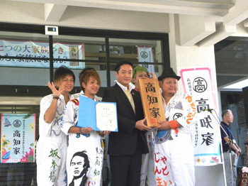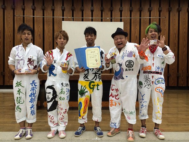 交付式では、思い思いの高知ゆかりのイラストをあしらったつなぎ姿で登壇したメンバーに、尾崎知事から委嘱状と特使の名刺などが手渡された。式には彼らのファン約300人も集まり、彼らの人気に尾崎知事も終始笑顔をみせていた。