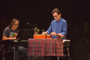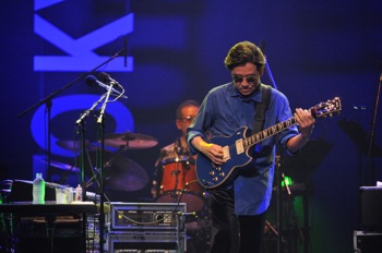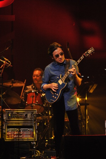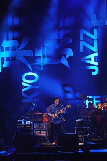 と、昔六本木のディスコでチャカの曲を聴いた思い出や、ルーファス・フィーチャリング・チャカ・カーンの名作『ルーファサイズド』に収録されている「ハーフ・ムーン」が好きという話などを、いつものようにひょうひょうとしたトーンで語る高中。そのまま、ファンにはおなじみの、鉄道模型や椰子の木をボディに乗っけた“ジオラマ・ギター”(模型の中に“TOKYO JAZZ”の文字を入れ込むという細かさ!)へと移動し、流麗なスライド奏法で、ジャズのスタンダード・ナンバー「Left Alone」を。ブラシを使った心地よい4ビートに乗り、後半はSGに持ち替えて美しいメロディを紡ぎ出す、このあたりがこの日最も“ジャズっぽい”ムードだったかもしれない。