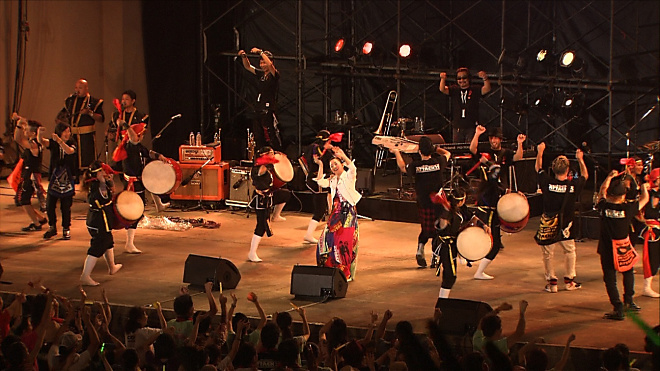 このスペシャルなひとときに酔いしれた後は、中村の「最後はこれだぁ!!」の合図とともに、琉球民謡の代表的なカチャーシー(三線の速弾き)である「唐船(とうしん)どーい」を、琉球國祭り太鼓とともにパフォーマンスし、集まった3,500人を魅了した。