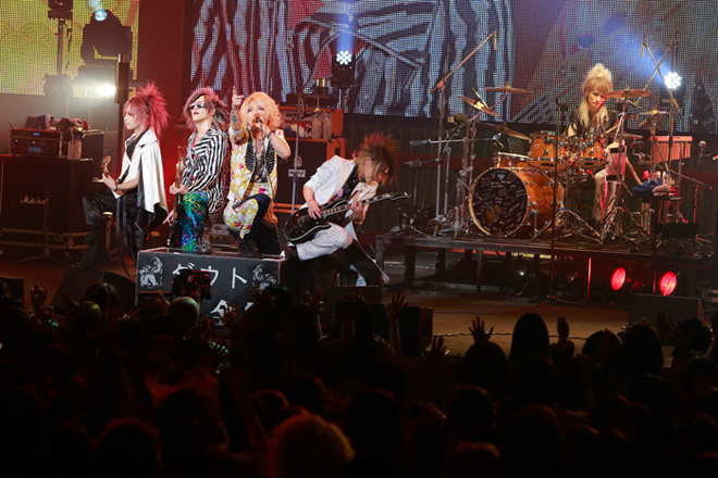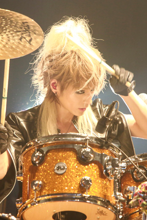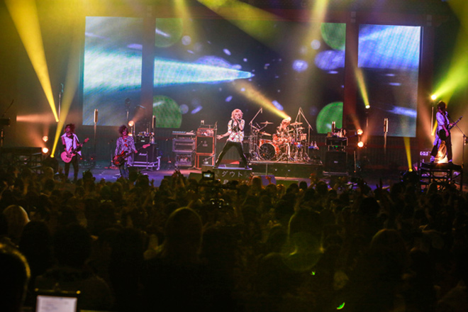 そんな幸樹(Vo)の言葉どおり、ライブは「ONE」からスタートすると、メンバーはそれぞれステージを縦横無尽にかけまわり、オーディエンスを煽りながらのダイナミックな演奏で畳み掛けた。これにしっかりと応えるように、客席からはヘドバンの嵐が巻き起こるなど、序盤から圧巻のシーンが続く。後半も、ミナセが和太鼓をたたいて登場するなど、会場をお祭りモードにした「バラ色の人生」から、「妄想天国」、「ざんげの花道」、「MUSIC NIPPON」とエンターテインメントに昇華していった。左右へのモッシュや大きくジャンプするなど、観客も息つく間もないアクティブさで一体感を見せていく。