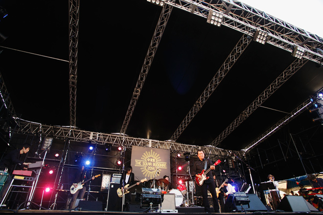メンバーは佐藤タイジ(G)、名越由貴夫(G)、ウエノコウジ(B)、武藤昭平(Dr)、高野勲(Key)、山本健太(Key)、タブゾンビ(Tp)、古市コータロー(G)。バンド名におこすと、シアターブルック、the HIATUS、勝手にしやがれ、SOIL&”PIMP”SESSION、THE COLLECTORS。もう名前を連ねるだけで、そのメンツの豪華さがわかるだろう。年代も音楽ジャンルも問わず集まったアーティストたちの共演にして伝説のステージをひと目見ようと、続々とオーディエンスが集まった。