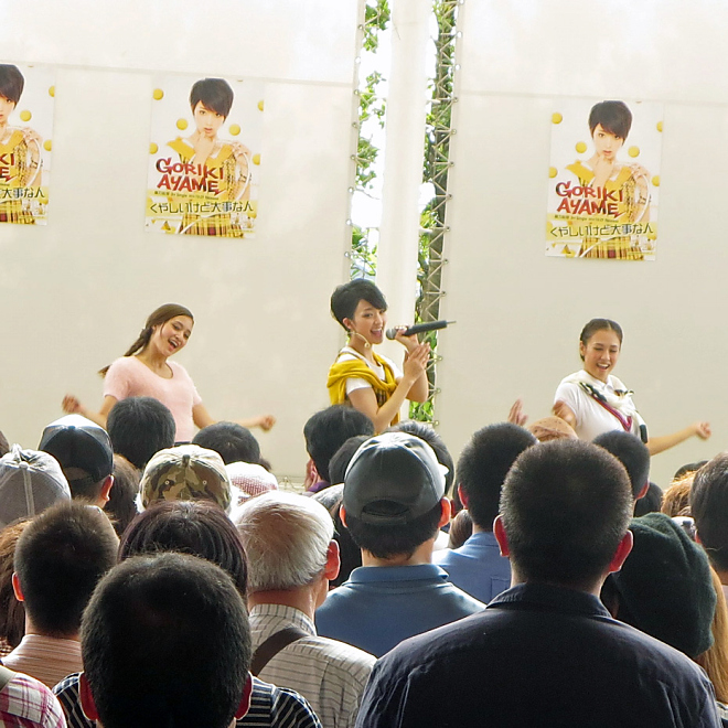 当日は現地に集合したファンに、元気いっぱいに「みなさん元気ですかー!」と声をかけてイベントスタート。台風が近づくなか天気が心配されたが、野外ステージは秋晴れを通り越して夏の様な日差しに。「晴れ女のパワーが発揮されました(笑)」と剛力も喜んでいた。