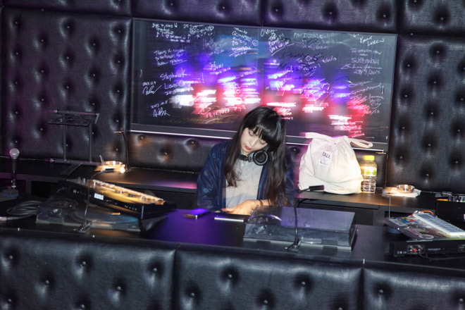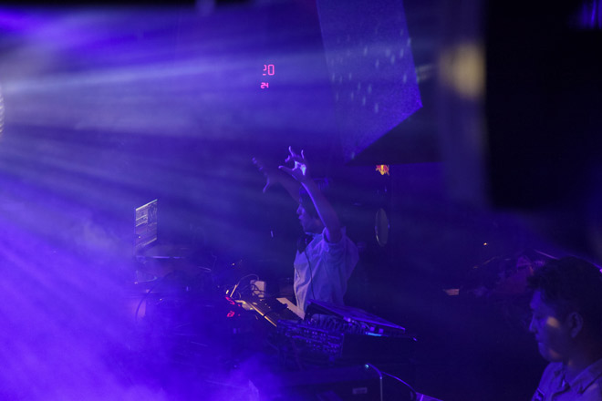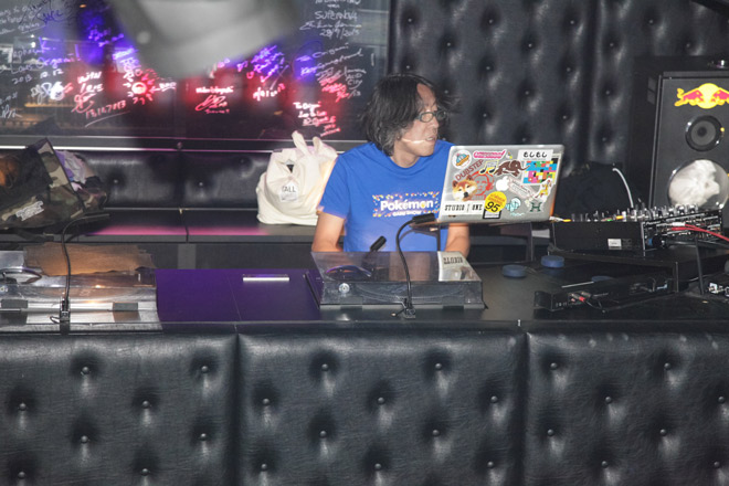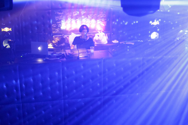 「supernova girl」で改めてライブをスタート。オリエンタルなボカロの声が響き4つ打ちのビートでミラーボールが回る会場を踊らせる。時折アルコールらしきグラスを口にしながらラップトップを操作しつつ激しく飛び跳ねるDE DE MOUSE。ドラマーとのロックテイストなライブやプラネタリウムでの穏やかなライブも魅力的だが、DJセットでもド迫力のボトムとやんちゃなパフォーマンスで観客と一体になるプレイスタイルで楽しませてくれる。ビートに合わせて光るミラーボールの下、見るとイベントスタート時の何倍ものお客さんが入っている。派手に点滅する照明とスモークの中、時折ピタッとブレイクして「ナニー!」「ダメだってー!」等と叫んでは観客を煽るDE DE MOUSE、レコーディング作品の繊細な音作りとライブでのギャップが彼が人気を得ている理由でもある。ライブ終盤、iPhoneをこちらに掲げて動画を回しているらしきDE DE MOUSEに応え一斉に歓声を上げる観客たち。最後はこの日3時間半に及び途切れることなく続いたライブのエンディングに相応しく、プラネタリウムを思わせるドリーミーなサウンドで幕を閉じた。