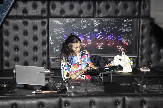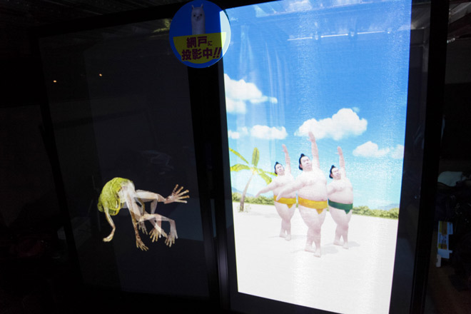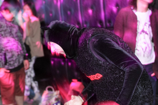 続いてaDanzaの生みの親である田中宏和ことChip Tanakaが登場すると、ステッカー貼りまくりのMacを置き会場に地響きを起こしながらプレイ。スモークやサーチライトなどの演出も目立つ中、自ら生み出したaDanzaのキャラクターたち、ビーチでPerfumeばりのトリオのダンスを見せる力士や、本体なしのビキニ水着、パイナップルが投影された網戸のスクリーンの中で踊り続けている。会場奥の椅子が置かれた一画では、アルパカの被り物を被って記念撮影している様子も見られ、先鋭的なビートとゆる~い空気が同居していることもイベントをユニークなものにしていた。