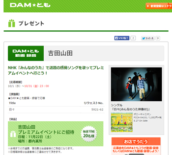 吉田山田の大ヒット曲「日々」を歌って応募するとプレミアムイベントに参加できる企画がDAM★ともで実施されている。