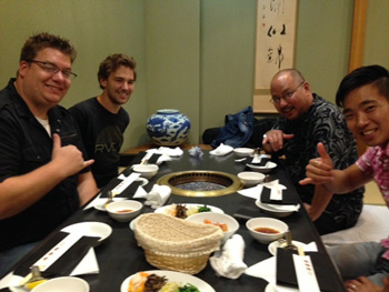 この短期集中連載も今回で最終回となりますが、まずは、ジャパン・ツアー(食べ歩きツアー)後半の様子をお伝えしましょう。大阪から福岡へ新幹線で乗り入れた一行は、到着するとすぐに「ラーメン食べたい!」。ラジオの生出演まで時間があるのをいいことに、みんなでラーメン屋さんに繰り出しました。初めてとんこつラーメンを食べるアメリカ人スタッフに、解説を加えるジェイク。さすがです。そして夜は、これまた博多名物の水炊き。鍋の前に出された“鶏のたたき”や“刺身”には、さすがのジェイクも恐る恐る。鶏肉を生で食べる習慣なんて、アメリカにはありませんからね。けれど、一口食べたら、「うん、おいしい!」。