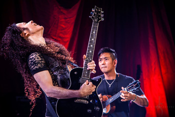 ツアーも残すところあと2公演となった恵比寿ガーデンホールでのライブには、スペシャル・ゲストが登場しました。ジェイクとは以前何度か日本のテレビ番組で共演したことがあるギタリスト、元メガデスのマーティ・フリードマンです。ギンギンのメタリック・サウンドを鳴らすマーティとジェイク、果たしてどうなることやら!?と思いましたが、エフェクターを多用する「Dragon」からの流れでの競演だっただけに違和感はなく、エネルギッシュでラウドなステージにお客さんもエキサイトしていたようです。