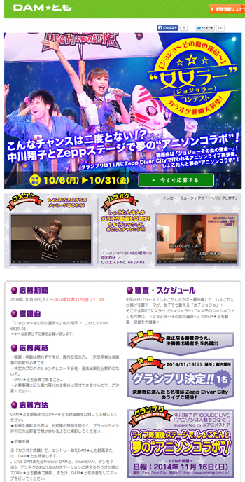 “しょこたん”こと中川翔子とZeppのステージで夢のアニソンコラボができる企画『女女ラー(ジョジョラー)コンテスト』企画がDAM★ともで実施されている。