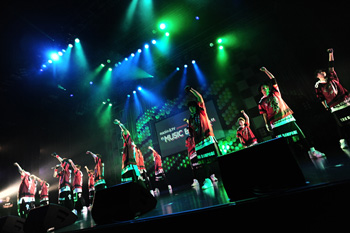 続いて、メンバーカラーを基調としたポップな制服に身を包み、SUPER☆GiRLSが登場。1曲目の「花道!!ア~ンビシャス」から、一気に会場を盛り上げ、堂々たるステージングを見せつける。キャッチーなサビ部分では、観客から手拍子や掛け声が起こり、会場は更に熱を帯びる。メンバーたちが団扇を振り回しながら踊る「アッハッハ!~超絶爆笑音頭~」では、観客もペンライトやタオルなどを振り回し、会場との一体感も高まった。