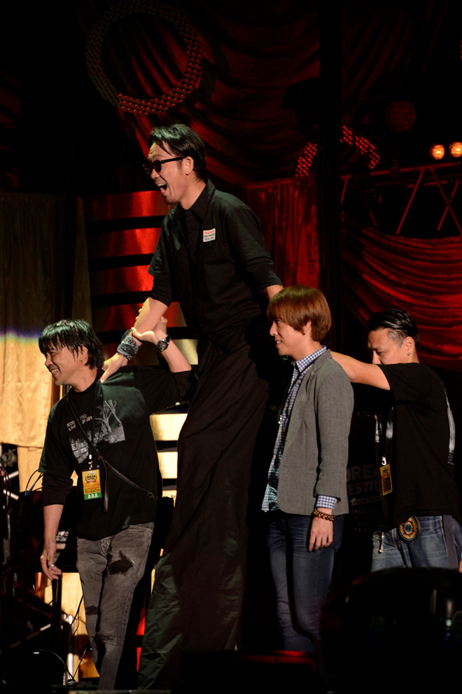 コブクロのライブは「代々木―!」の掛け声から「君という名の翼」で勢いよくスタートしたが、ステージ上に登場したのは小渕ひとりだけ。そこへやってきたのが高下駄を履き3メートルを超す超長身となった黒田だった。もちろん会場は爆笑である。
