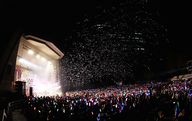 本編ラストは、ファンとともにその絆を確かめ合うかのように「絆」を合唱し、メンバーはいったんステージを後にする。そして、アンコールで「七色の鳥」を披露すると、ファンが配ったサイリウムによって、日比谷野外大音楽堂の客席に七色の虹が描かれるというサプライズが。これにはメンバーも大興奮、ステージから観た景色に喜びを噛み締めていた(ハッシュタグ「#風男塾野音」でツイートを検索するとこの光景を楽しむことができる)。最後は「下を向いて帰ろう」を力強く歌い上げ、風男塾はこの日のステージの幕を下ろした。