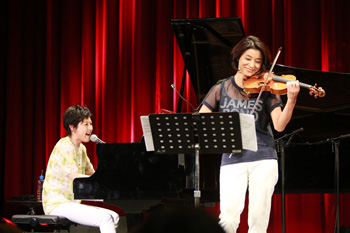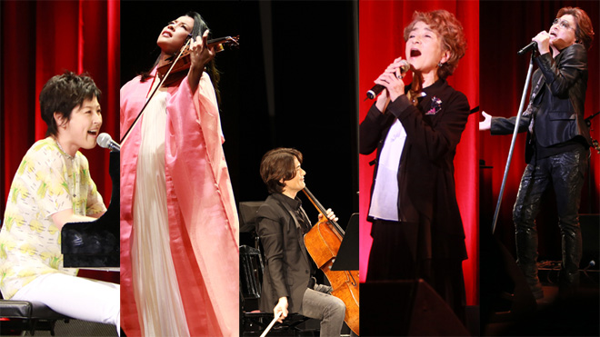 続いてはヴァイオリン奏者の川井郁子。共に舞台に上がったのは福島出身の尺八奏者の小湊昭尚。川井は「(この会場が)エールの気持ちがひとつになれる場所になれればと思ってます」と話し、仙台で育った荒川静香が使った「夕顔」や、仙台出身の羽生結弦がエキシビションで使った「ホワイト・レジェンド」など、東北ゆかりの楽曲を「和」のアレンジでじっくりしっとりと演奏した。
