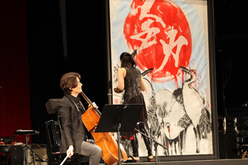 溝口は「被災地を訪れ、周囲に何もない風景を見た時、鳥の声だけが聞こえました。その時に感じた思いの曲を今日演奏します」と、この日の為にに選曲したのはパブロ・カザルスの「鳥の歌」。さらに、このコラボレーションのために今朝出来上がったばかりという新曲を用意。溝口肇が弾くチェロにあわせ、紫舟が大きな筆を抱えながら絵を描いていく。広い会場は水を打ったように静かになり、両者のパフォーマンスをじっと見守る。
