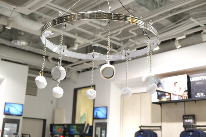 BeYoはウーファー搭載のポータブルスピーカーで、小ぶりで軽量…そう、ちょうどおにぎりくらいの大きさなのだけど、驚くほど重厚で実在感のあるサウンドが会場を満たしていた。8つあるとはいえ、こんな小さなポータブルスピーカーが、しかも空中にぶら下げられた状態で、重低音&高音質を実現しているのが新鮮な驚きだった。
