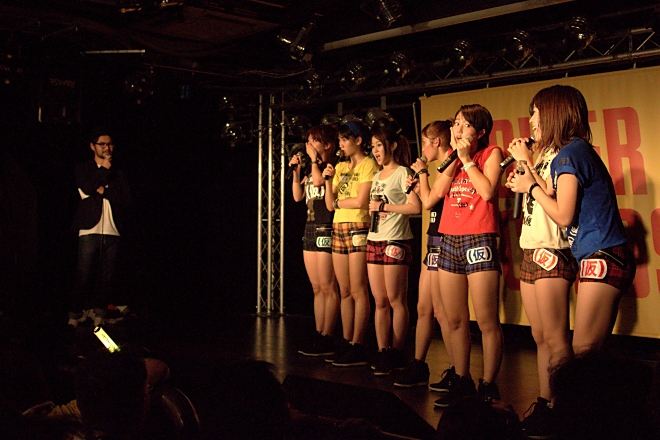 そしてイベントも残り一曲になったところで、SEと共にアプガの前にT-Palette Recordsの吉野氏が登場。例によってサプライズ展開へおののくメンバー達へ、吉野氏から現時点でのニューシングル予約状況が発表された。本作シングルでのアプガの目標は売上1万枚。オリコンTOP10入りを果たすための具体的な目標として挙げられた数字だが、現時点での途中経過は4532枚とのこと。アプガの面々ははじめ「すごい…」と驚きの声をあげていたが、すぐさま吉野氏の「一万枚の半分って何枚でしたっけ?」というフリが入り、これには回答を求められた佐藤綾乃もタジタジな様子。