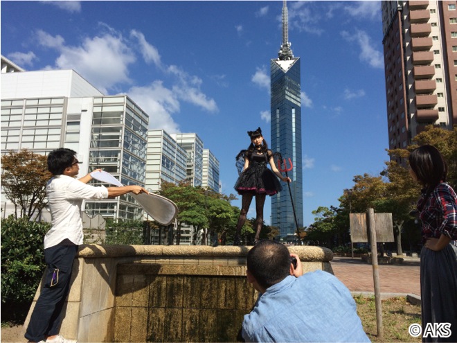 熊沢:(撮影の合間)色んな衣装を着て博多の街を回っていると通行されている方からすごいジロジロ見られてちょっと恥ずかしかったですが頑張りました。(撮影時に意識したのは)お昼になったら太陽が出てきて、私自身、直射日光で目をあけるのが苦手なのでそこを意識しました。