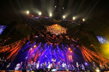 神戸初日のエンディングを飾るのは、VAMPS、DAIGO、MUCC、Tommy heavenly6、明希 、分島花音、ナイトメアの柩、Shinya 、ROLLY、Silent Siren、そしてD’ERLANGERのkyoによる恒例のスペシャルバンド、HALLOWEEN JUNKY ORCHESTRAによるセッション・タイム。美脚を強調したインディアンハット姿のMONORALのAnisが「Let It Go」を歌いながら登場したところで、Anis提案の「アフリカの子供たちのゲーム」という太鼓を使ったリズムゲームへ。