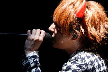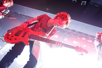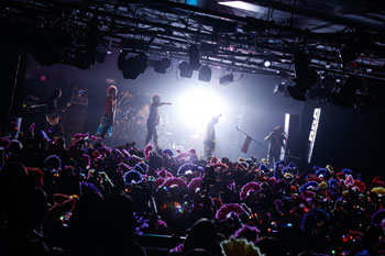 そんな胸に熱い秘めた想いを、現代社会を痛烈に批判するメッセージを、周りの人達への感謝の言葉を、自由奔放にはしゃぎ回るサウンドに乗せ、やりたい放題やりまくった『ハイカラ』の楽曲達を矢継ぎ早に繰り出して行く5人。「新人類」では、トリッキーかつ重心低めに疾走するヘヴィサウンドでフロアに壮絶なヘッドバンギングを巻き起こし、感傷的なサウンドが胸を打つ「大雪警報」では、Takashi(Gt)がキーボードを、Daisuke(Gt)がアコースティックギターを披露。Takeshi(Dr)はスティックを使わずに素手で激しいドラムソロを繰り広げ、「万歳\(・∀・)/Music!」では、楽器を置いてメンバー全員がボーカルを務めるカメレオ恒例のパフォーマンスでハッピーな空間を作り上げていく。また、ステージにダンサーが登場するなど、エンタメ要素が強いライヴを繰り広げるカメレオだが、この日の「ダメ男」ではいつもとは違う形でダンサーが乱入するなど、その変幻自在で予測不能っぷりに磨きをかけていた。