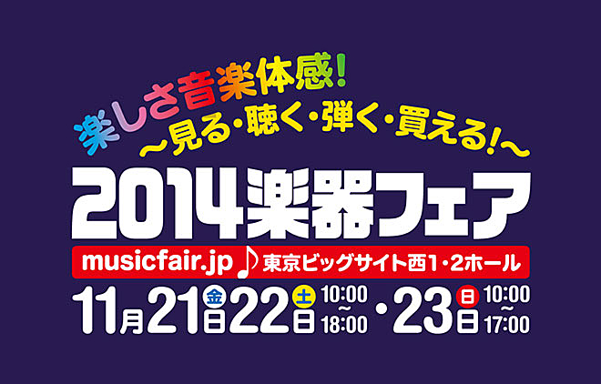 前回の「2011楽器フェア」(パシフィコ横浜で2011年11月3~6日開催)から3年のインターバルをおいて開催される「2014楽器フェア」は、会場を東京ビッグサイトに移し、楽器店も参加する販売エリアを新たに設けてパワーアップ。楽器人口の拡大を目的に「楽しさ音楽体感!2014楽器フェア~見る・聴く・弾く・買える!~」をテーマに、世界最大級の楽器コンシューマー・ショーを目指す。