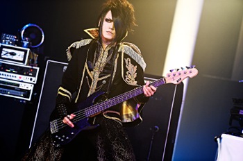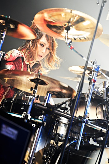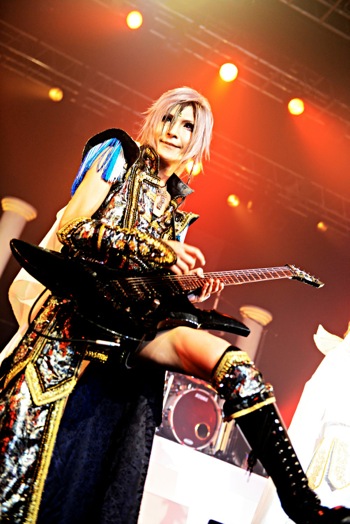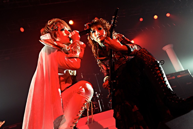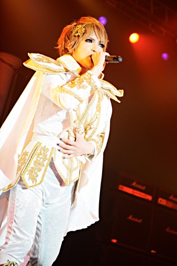 SEが展開を迎えたとき、この宮殿の主がスポットライトを浴びながらついに現われた。YUKI(Dr)が笑みをこぼしながら一礼してドラムにスタンバイ。妖艶なムードを放つHIZAKI(G)、きらびやかなTERU(G)、邪悪な男爵のMASASHI(B)、そして最後に貴公子のような純白の衣装でZIN(Vo)も登場。しかし今夜、この5人が宮殿で繰り広げるのは舞踏会ではない。