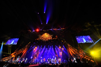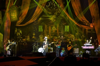 そして待ちに待ったVAMPSの登場だ。場内が暗転すると一斉にステージへ目を向けるオーディエンス。しかしSEが鳴るも、メンバーの姿は一向に見えない。すると、会場後方からから光り輝く馬車が登場したのだ。このサプライズな登場に会場が湧き立つが、馬車から降りるメンバーのなかにHYDEの姿はない。そしてアリーナ最後方で、割れんばかりの歓声と嬌声が響いた。スポットライトが浮かび上げたのは、PA後ろの小さな特設ステージに現れたHYDEだ。オープニングナンバーの「THE JOLLY ROGER」から会場を煽りまくるHYDEに対して、メインステージではキャプテン·ハーロックに扮したK.A.Zが鋭いギターで応戦していく。「REVOLUTION II」ではフロートに乗りこみ、観客にCO2砲をブチかまして不敵な笑みを浮かべるHYDEが、重低音が響き渡るなか“Everybody Scream!!!”と何度も叫んで会場の熱を上げた。