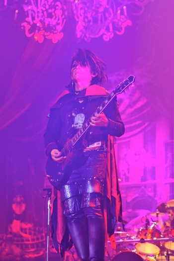 MCでは敬愛する神(=HYDE)から、「新宿のホストでしょ?」と仮装を突っ込まれたという楽屋エピソードに会場は大爆笑。さらに、自身の誕生日にHYDEから贈られた「オートクチュールの一点物のロック手袋」をマイクスタンドに祀っている映像がヴィジョンに映し出されると、これまた会場が大爆笑。会場全員が二礼二拍手一礼の御参りでイベントの盛り上がりを祈願するなど、サービス精神たっぷりで会場を盛り上げていく。