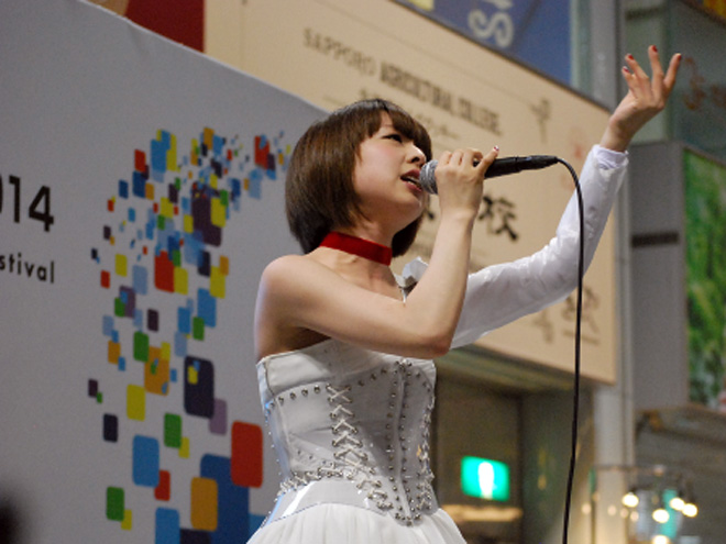 今回出演した<新千歳空港アニメ映画祭2014>では、デビュー曲「ideal white」はもちろん、地元北海道のプロデューサー集団I’ve制作のカップリング曲「pledge of stars」を歌いあげ、自身の生まれ育った北海道への想いを強く感じさせるパフォーマンスを繰り広げた。