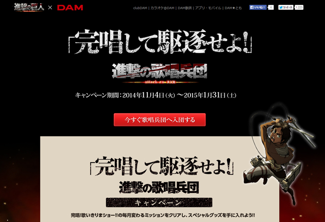DAMが『進撃の巨人』とコラボレーションを開始。毎月変わるミッションをクリアしスペシャルグッズをゲットできる『完唱! 歌いきりまショー!!』で、“「完唱して駆逐せよ!」進撃の歌唱兵団キャンペーン”を実施している。