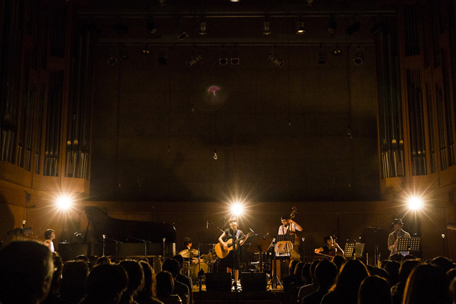 今回が初のお披露目という、この編成でのアレンジも新鮮。「Keep Silence」では、チェロとフルートの流麗な掛け合いと、力強く踏みならされる大太鼓、軽やかに舞うピアノのオブリガードが楽曲を華やかに彩る。まるで60年代のバロック・ポップのようだ。