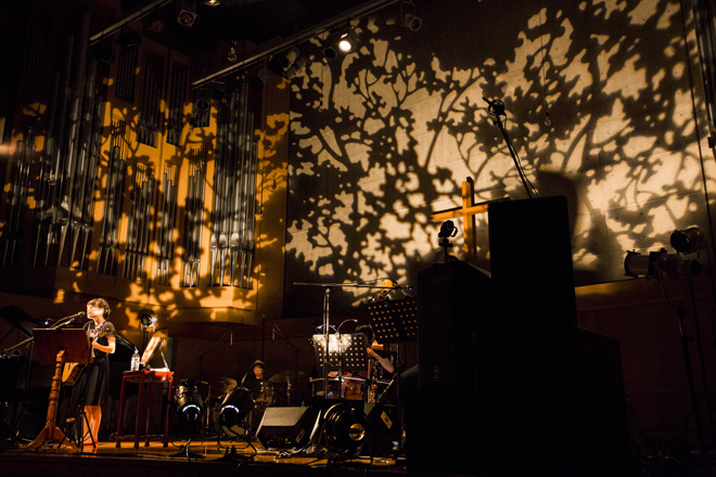 教会ならではの声の響きも格別で、天上から降り注ぐリヴァーブに包まれた「Don’t Break My Heart」、「Tunnel Light」、「Autumn Moon」と続く3曲は、まるでジュディ・シルのように厳かで美しい。…と思って聴き入っていたら、例によって脱力&自虐MCが始まり、会場の笑いを誘う。