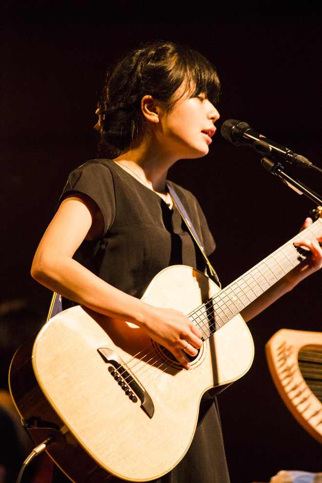 アコギを抱え、「Skipping Ticks」のイントロを爪弾き始めると、サポート・メンバーが次々と現れた。最近お馴染みの神谷洵平(ドラム)とガリバー鈴木(コントラバス)に加え、小林奈那子(チェロ)、武嶋聡(フルート/クラリネット/ソプラノ・サックス)、そしてRayonsこと中井雅子(グランドピアノ)の6人が揃う。朋友RayonsはPredawnと対をなすように白いワンピースを着ている。