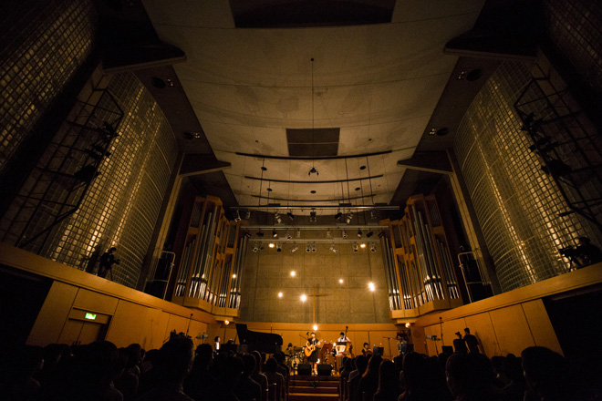 小雨が降る中、会場へと向かう。品川駅から徒歩10分ほどにあるその教会は、コンクリート打ちっ放しの近代的な建物。大きな十字架が掲げられたステージの脇にはパイプオルガンがそびえ立ち、吹き抜けの天上も3階ほどの高さがある。すでに20~30代の女性を中心に、男女問わず幅広い年齢層が集まっている。追加の席が出るほど盛況だ。